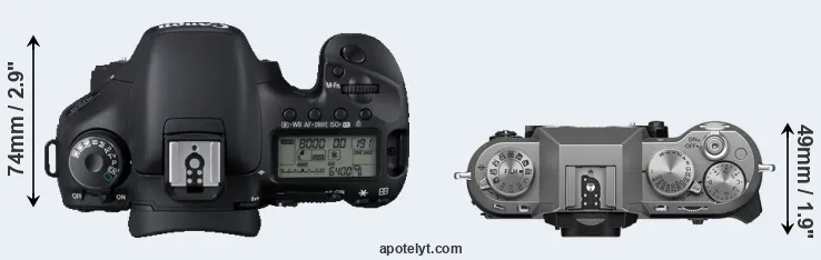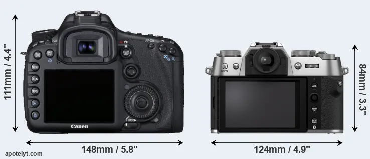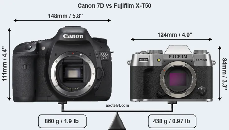 La taille physique et le poids du Canon 7D et du Fujifilm X-T50 sont illustrés dans le graphique ci-dessous. Les deux caméras sont affichées en fonction de leur taille relative. Toutes les dimensions sont arrondies au millimètre près.
