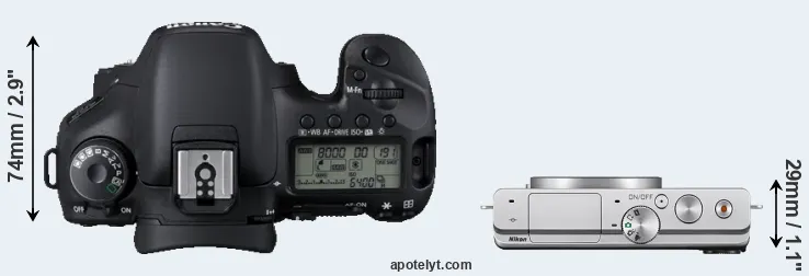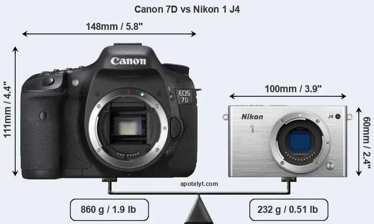 La taille physique et le poids du Canon 7D et du Nikon 1 J4 sont illustrés dans le graphique ci-dessous. Les deux caméras sont affichées en fonction de leur taille relative. Toutes les dimensions sont arrondies au millimètre près.