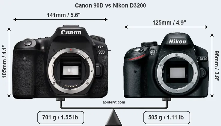 La taille physique et le poids du Canon 90D et du Nikon D3200 sont illustrés dans le graphique ci-dessous. Les deux caméras sont affichées en fonction de leur taille relative. Toutes les dimensions sont arrondies au millimètre près.