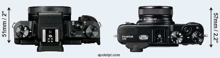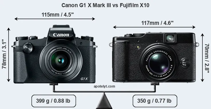 La taille physique et le poids du Canon G1 X Mark III et du Fujifilm X10 sont illustrés dans le graphique ci-dessous. Les deux caméras sont affichées en fonction de leur taille relative. Toutes les dimensions sont arrondies au millimètre près.