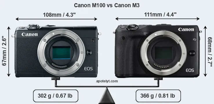 La taille physique et le poids du Canon M100 et du Canon M3 sont illustrés dans le graphique ci-dessous. Les deux caméras sont affichées en fonction de leur taille relative. Toutes les dimensions sont arrondies au millimètre près.