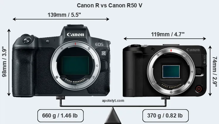 Le Canon EOS R et le Canon EOS R50 V sont deux appareils photo numériques, qui ont été révélés au public, respectivement, en September 2018 et March 2025. Les deux sont des appareil photo à objectif interchangeable sans miroir, qui sont équipés d'un capteur plein format (Canon R) et un capteur APS-C (R50 V). Le Canon R a une résolution de 30,1 mégapixels, alors que le R50 V fournit 24,0 MP.