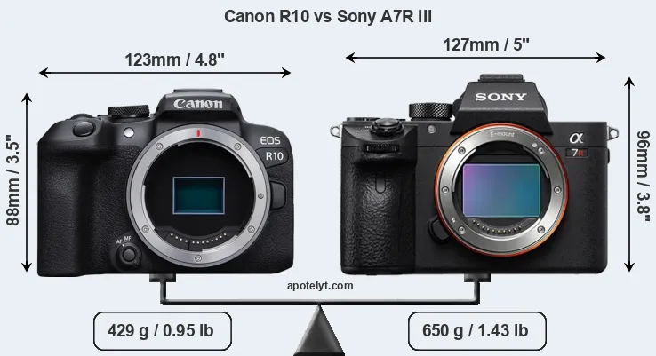 Le Canon EOS R10 et le Sony Alpha A7R III sont deux appareils photo numériques, qui ont été révélés au public, respectivement, en May 2022 et October 2017. Les deux sont des appareil photo à objectif interchangeable sans miroir, qui sont équipés d'un capteur APS-C (R10) et un capteur plein format (A7R III). Le Canon a une résolution de 24,0 mégapixels, alors que le Sony fournit 42,2 MP.