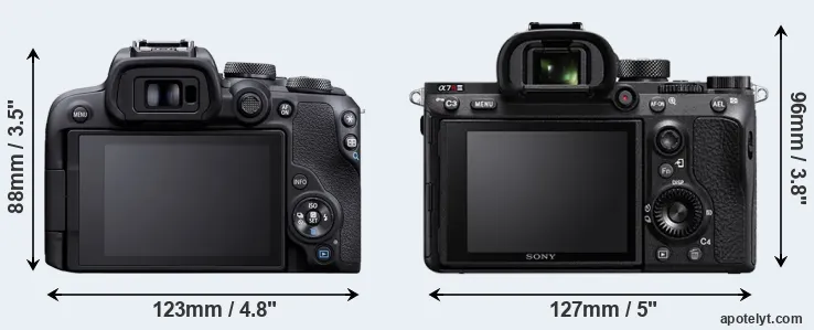 La taille physique et le poids du Canon R10 et du Sony A7R III sont illustrés dans le graphique ci-dessous. Les deux caméras sont affichées en fonction de leur taille relative. Toutes les dimensions sont arrondies au millimètre près.