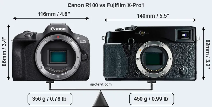 La taille physique et le poids du Canon R100 et du Fujifilm X-Pro1 sont illustrés dans le graphique ci-dessous. Les deux caméras sont affichées en fonction de leur taille relative. Toutes les dimensions sont arrondies au millimètre près.