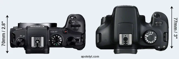 Le Canon EOS RP et le Canon EOS Rebel T100 sont deux appareils photo numériques, qui ont été révélés au public, respectivement, en February 2019 et February 2018. Le RP est un appareil photo à objectif interchangeable sans miroir, tandis que le T100 est un appareil photo reflex numérique. Les caméras sont équipés d'un capteur plein format (RP) et un capteur APS-C (T100). Le RP a une résolution de 26,0 mégapixels, alors que le T100 fournit 17,9 MP.