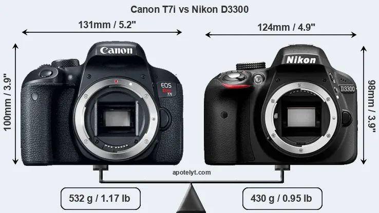 La taille physique et le poids du Canon T7i et du Nikon D3300 sont illustrés dans le graphique ci-dessous. Les deux caméras sont affichées en fonction de leur taille relative. Toutes les dimensions sont arrondies au millimètre près.