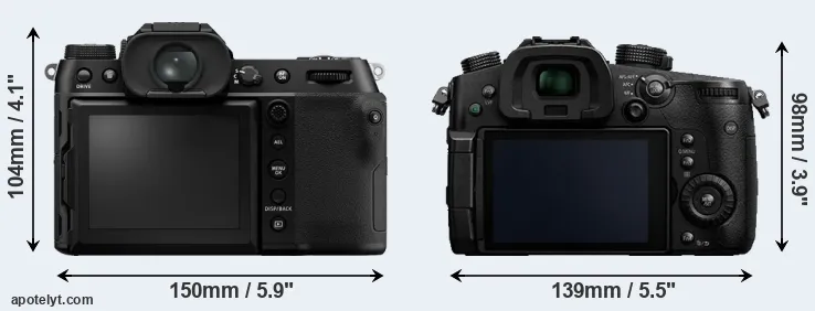 La taille physique et le poids du Fujifilm GFX 100S et du Panasonic GH5 sont illustrés dans le graphique ci-dessous. Les deux caméras sont affichées en fonction de leur taille relative. Toutes les dimensions sont arrondies au millimètre près.