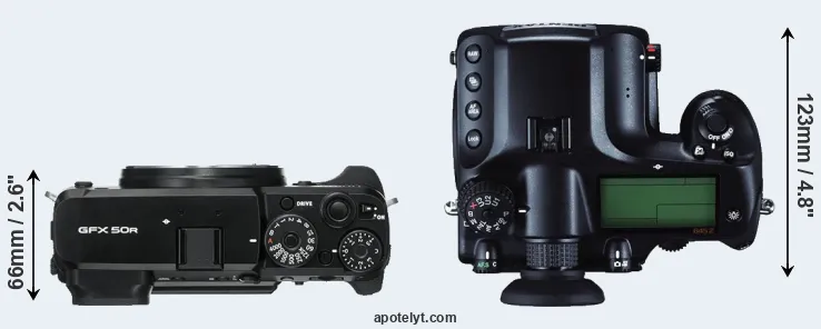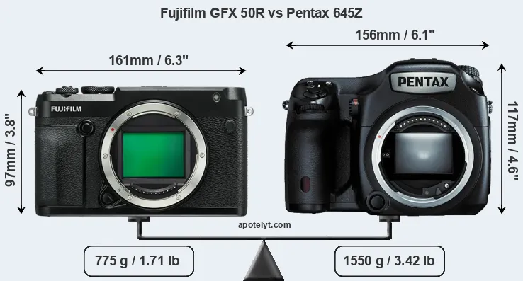 La taille physique et le poids du Fujifilm GFX 50R et du Pentax 645Z sont illustrés dans le graphique ci-dessous. Les deux caméras sont affichées en fonction de leur taille relative. Toutes les dimensions sont arrondies au millimètre près.