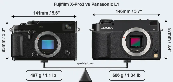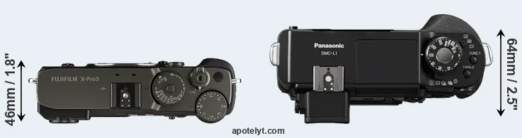 La taille physique et le poids du Fujifilm X-Pro3 et du Panasonic L1 sont illustrés dans le graphique ci-dessous. Les deux caméras sont affichées en fonction de leur taille relative. Toutes les dimensions sont arrondies au millimètre près.
