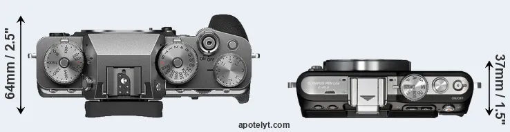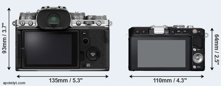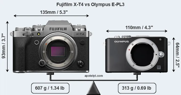 La taille physique et le poids du Fujifilm X-T4 et du Olympus E-PL3 sont illustrés dans le graphique ci-dessous. Les deux caméras sont affichées en fonction de leur taille relative. Toutes les dimensions sont arrondies au millimètre près.