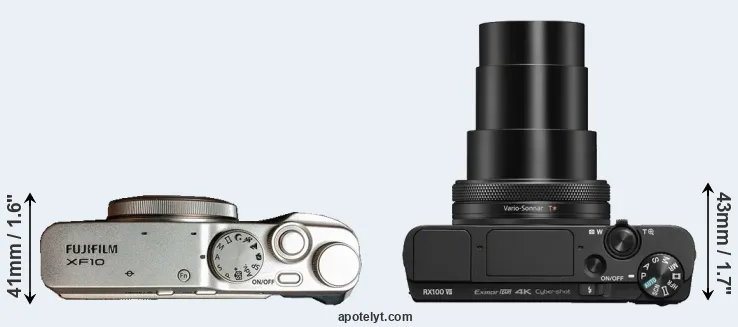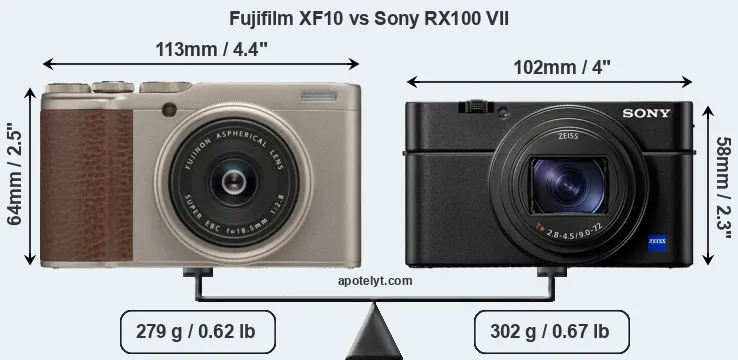La taille physique et le poids du Fujifilm XF10 et du Sony RX100 VII sont illustrés dans le graphique ci-dessous. Les deux caméras sont affichées en fonction de leur taille relative. Toutes les dimensions sont arrondies au millimètre près.