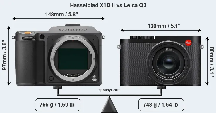 Le Hasselblad X1D II 50C et le Leica Q3 sont deux appareils photo numériques, qui ont été révélés au public, respectivement, en June 2019 et May 2023. Le X1D II est un appareil photo à objectif interchangeable sans miroir, tandis que le Q3 est un appareil photo compact à objectif intégré. Les caméras sont équipés d'un capteur moyen format (X1D II) et un capteur plein format (Q3). Le Hasselblad a une résolution de 51,3 mégapixels, alors que le Leica fournit 60,3 MP.