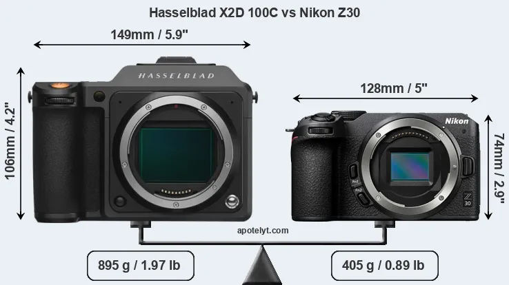 Le Hasselblad X2D 100C et le Nikon Z30 sont deux appareils photo numériques, qui ont été révélés au public, respectivement, en September 2022 et June 2022. Les deux sont des appareil photo à objectif interchangeable sans miroir, qui sont équipés d'un capteur moyen format (X2D 100C) et un capteur APS-C (Z30). Le Hasselblad a une résolution de 102,1 mégapixels, alors que le Nikon fournit 20,7 MP.