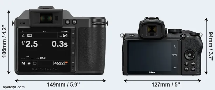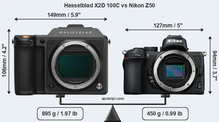 Le Hasselblad X2D 100C et le Nikon Z50 sont deux appareils photo numériques, qui ont été révélés au public, respectivement, en September 2022 et October 2019. Les deux sont des appareil photo à objectif interchangeable sans miroir, qui sont équipés d'un capteur moyen format (X2D 100C) et un capteur APS-C (Z50). Le Hasselblad a une résolution de 102,1 mégapixels, alors que le Nikon fournit 20,7 MP.