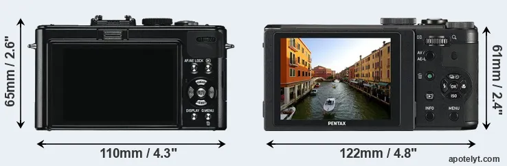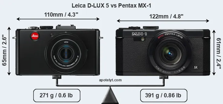 La taille physique et le poids du Leica D-LUX 5 et du Pentax MX-1 sont illustrés dans le graphique ci-dessous. Les deux caméras sont affichées en fonction de leur taille relative. Toutes les dimensions sont arrondies au millimètre près.