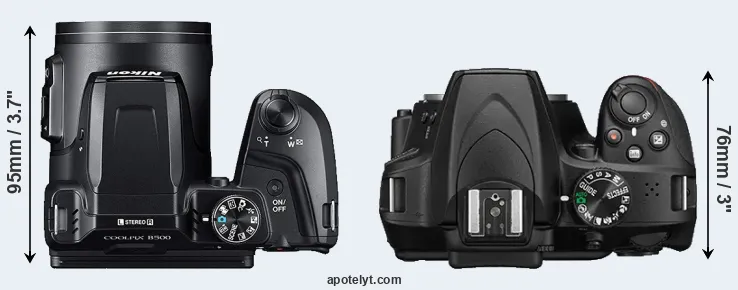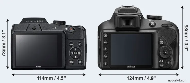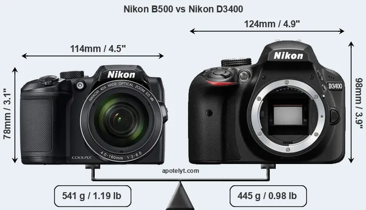 La taille physique et le poids du Nikon B500 et du Nikon D3400 sont illustrés dans le graphique ci-dessous. Les deux caméras sont affichées en fonction de leur taille relative. Toutes les dimensions sont arrondies au millimètre près.