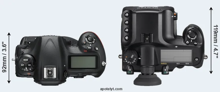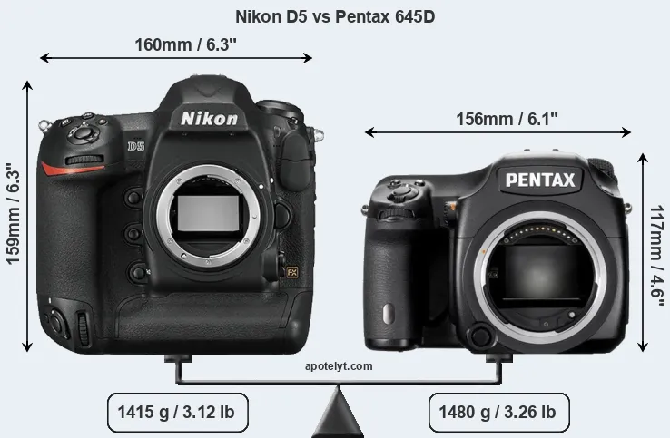 La taille physique et le poids du Nikon D5 et du Pentax 645D sont illustrés dans le graphique ci-dessous. Les deux caméras sont affichées en fonction de leur taille relative. Toutes les dimensions sont arrondies au millimètre près.
