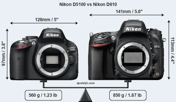 La taille physique et le poids du Nikon D5100 et du Nikon D610 sont illustrés dans le graphique ci-dessous. Les deux caméras sont affichées en fonction de leur taille relative. Toutes les dimensions sont arrondies au millimètre près.