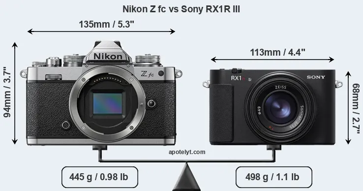 Le Nikon Z fc et le Sony Cyber-shot DSC-RX1R III sont deux appareils photo numériques, qui ont été révélés au public, respectivement, en June 2021 et July 2025. Le Z fc est un appareil photo à objectif interchangeable sans miroir, tandis que le RX1R III est un appareil photo compact à objectif intégré. Les caméras sont équipés d'un capteur APS-C (Z fc) et un capteur plein format (RX1R III). Le Nikon a une résolution de 20,7 mégapixels, alors que le Sony fournit 60,2 MP.