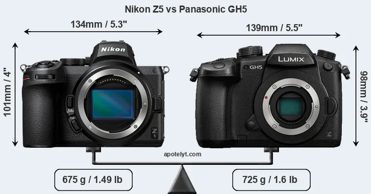 Le Nikon Z5 et le Panasonic Lumix DC-GH5 sont deux appareils photo numériques, qui ont été révélés au public, respectivement, en July 2020 et January 2017. Les deux sont des appareil photo à objectif interchangeable sans miroir, qui sont équipés d'un capteur plein format (Z5) et un capteur quatre tiers (GH5). Le Nikon a une résolution de 24,2 mégapixels, alors que le Panasonic fournit 20,2 MP.