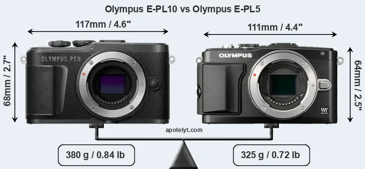 Le Olympus PEN E-PL10 et le Olympus PEN E-PL5 sont deux appareils photo numériques, qui ont été révélés au public, respectivement, en October 2019 et September 2012. Les deux sont des appareil photo à objectif interchangeable sans miroir, qui sont équipés d'un capteur quatre tiers. Les deux caméras offrent une résolution de 15,9 mégapixels.