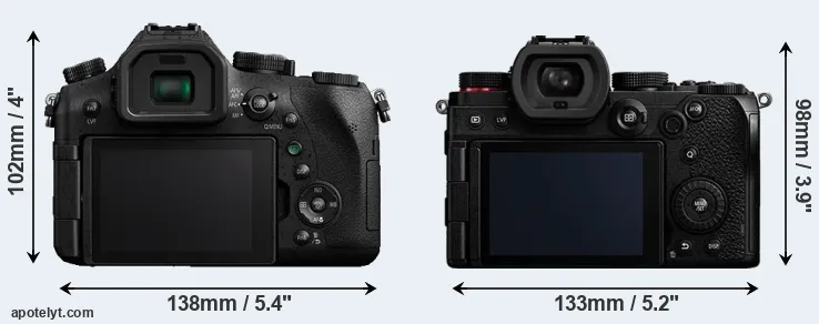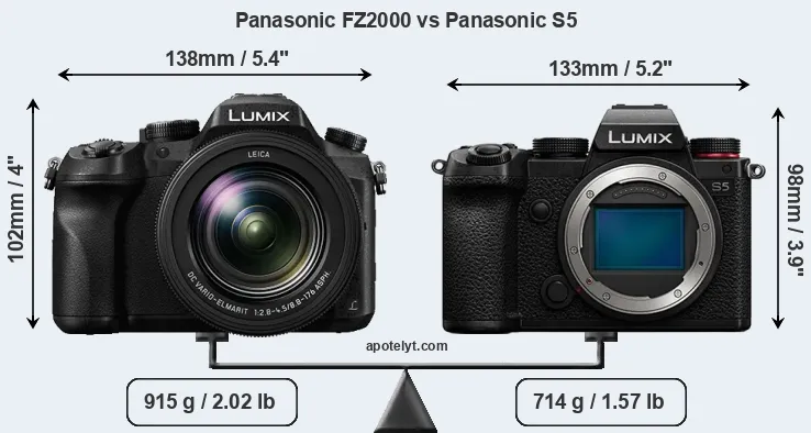 La taille physique et le poids du Panasonic FZ2000 et du Panasonic S5 sont illustrés dans le graphique ci-dessous. Les deux caméras sont affichées en fonction de leur taille relative. Toutes les dimensions sont arrondies au millimètre près.
