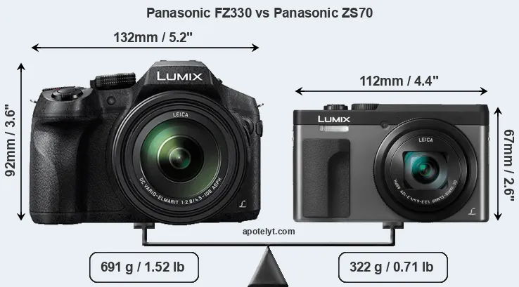 La taille physique et le poids du Panasonic FZ330 et du Panasonic ZS70 sont illustrés dans le graphique ci-dessous. Les deux caméras sont affichées en fonction de leur taille relative. Toutes les dimensions sont arrondies au millimètre près.
