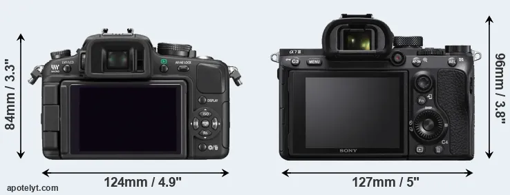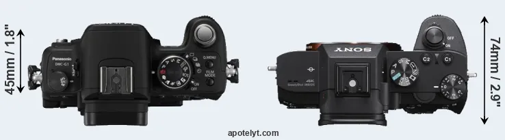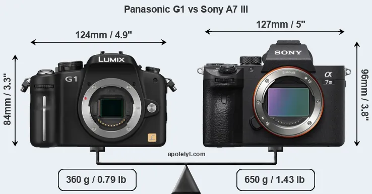 La taille physique et le poids du Panasonic G1 et du Sony A7 III sont illustrés dans le graphique ci-dessous. Les deux caméras sont affichées en fonction de leur taille relative. Toutes les dimensions sont arrondies au millimètre près.