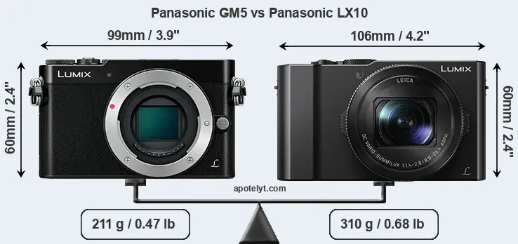 La taille physique et le poids du Panasonic GM5 et du Panasonic LX10 sont illustrés dans le graphique ci-dessous. Les deux caméras sont affichées en fonction de leur taille relative. Toutes les dimensions sont arrondies au millimètre près.