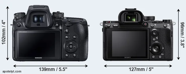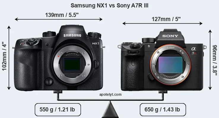 La taille physique et le poids du Samsung NX1 et du Sony A7R III sont illustrés dans le graphique ci-dessous. Les deux caméras sont affichées en fonction de leur taille relative. Toutes les dimensions sont arrondies au millimètre près.