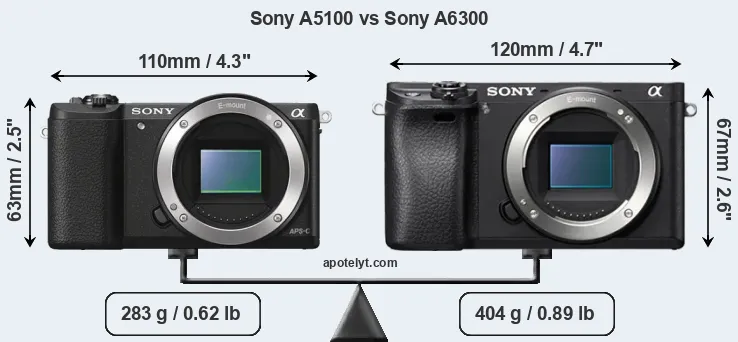La taille physique et le poids du Sony A5100 et du Sony A6300 sont illustrés dans le graphique ci-dessous. Les deux caméras sont affichées en fonction de leur taille relative. Toutes les dimensions sont arrondies au millimètre près.