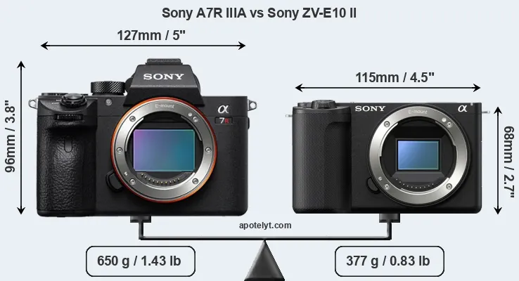 Le Sony Alpha A7R IIIA et le Sony ZV-E10 II sont deux appareils photo numériques, qui ont été révélés au public, respectivement, en April 2021 et July 2024. Les deux sont des appareil photo à objectif interchangeable sans miroir, qui sont équipés d'un capteur plein format (A7R IIIA) et un capteur APS-C (ZV-E10 II). Le A7R IIIA a une résolution de 42,2 mégapixels, alors que le ZV-E10 II fournit 25,6 MP.
