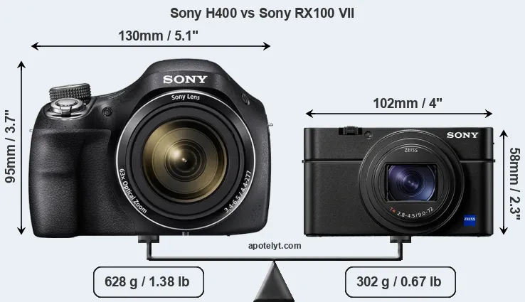 La taille physique et le poids du Sony H400 et du Sony RX100 VII sont illustrés dans le graphique ci-dessous. Les deux caméras sont affichées en fonction de leur taille relative. Toutes les dimensions sont arrondies au millimètre près.