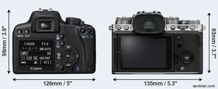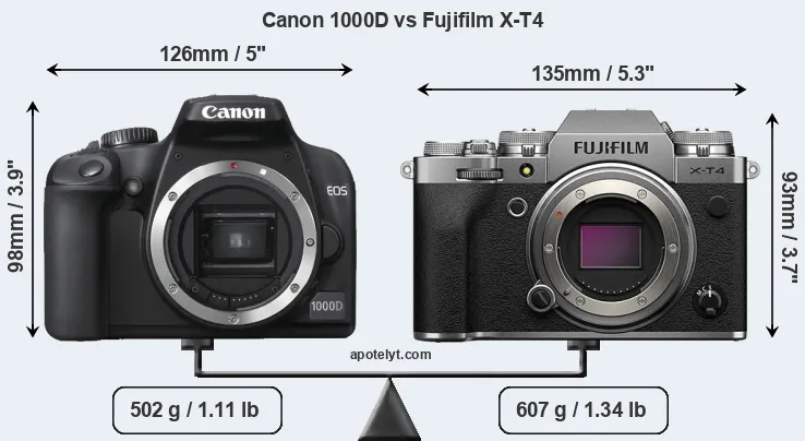 La Canon EOS 1000D e la Fujifilm X-T4 sono due fotocamere digitali rivelate al pubblico rispettivamente a giugno 2008 e febbraio 2020. Il 1000D è una fotocamera DSLR, mentre X-T4 è una fotocamera mirrorless con obiettivo intercambiabile.Entrambe le fotocamere sono dotati di un sensore APS-C. La Canon ha una risoluzione di 10,1 megapixel, mentre la Fujifilm fornisce 26,0 MP.