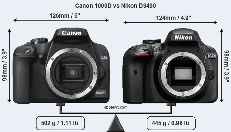 La Canon EOS 1000D e la Nikon D3400 sono due fotocamere digitali rivelate al pubblico rispettivamente a giugno 2008 e agosto 2016. Entrambe sono fotocamere DSLR (Digital Single Lens Reflex) che sono dotati di un sensore APS-C. La Canon ha una risoluzione di 10,1 megapixel, mentre la Nikon fornisce 24,0 MP.