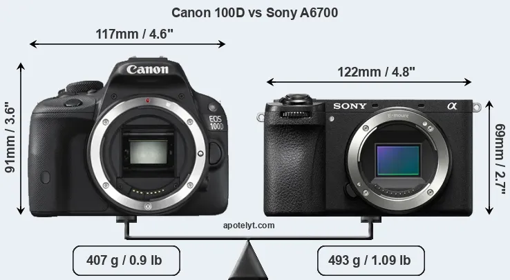 La dimensione fisica e il peso della Canon 100D e Sony A6700 sono illustrate nel grafico sottostante. Le due fotocamere vengono visualizzate in base alle loro dimensioni relative. Tutte le dimensioni sono arrotondate al millimetro più vicino.