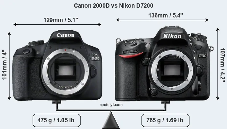 La Canon EOS 2000D e la Nikon D7200 sono due fotocamere digitali rivelate al pubblico rispettivamente a febbraio 2018 e marzo 2015. Entrambe sono fotocamere DSLR (Digital Single Lens Reflex) che sono dotati di un sensore APS-C. Entrambe le fotocamere offrono una risoluzione di 24,0 megapixel.