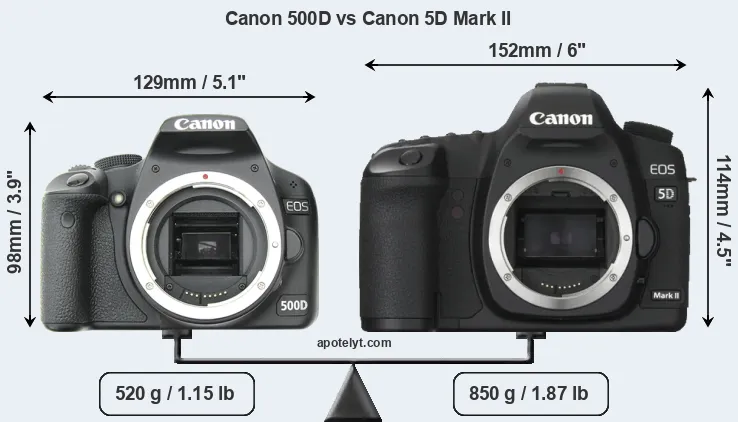 La Canon EOS 500D e la Canon EOS 5D Mark II sono due fotocamere digitali rivelate al pubblico rispettivamente a marzo 2009 e settembre 2008. Entrambe sono fotocamere DSLR (Digital Single Lens Reflex) che sono dotati di un sensore APS-C (500D) e un sensore full frame (5D Mark II). La 500D ha una risoluzione di 15,1 megapixel, mentre la 5D Mark II fornisce 21,0 MP.