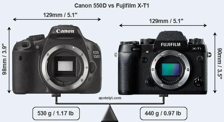 La Canon EOS 550D e la Fujifilm X-T1 sono due fotocamere digitali rivelate al pubblico rispettivamente a febbraio 2010 e gennaio 2014. Il 550D è una fotocamera DSLR, mentre X-T1 è una fotocamera mirrorless con obiettivo intercambiabile.Entrambe le fotocamere sono dotati di un sensore APS-C. La Canon ha una risoluzione di 17,9 megapixel, mentre la Fujifilm fornisce 16,0 MP.