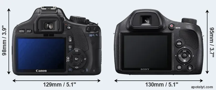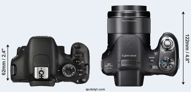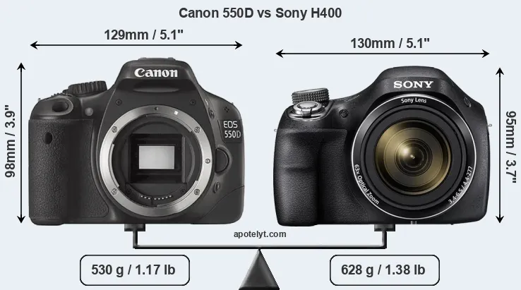 La Canon EOS 550D e la Sony Cyber-shot DSC-H400 sono due fotocamere digitali rivelate al pubblico rispettivamente a febbraio 2010 e febbraio 2014. Il 550D è una fotocamera DSLR, mentre H400 è una fotocamera compatta con obiettivo integrato. Le fotocamere sono dotati di un sensore APS-C (550D) e un sensore da 1/2,3 pollice (H400). La Canon ha una risoluzione di 17,9 megapixel, mentre la Sony fornisce 19,9 MP.