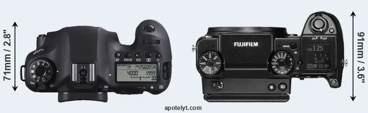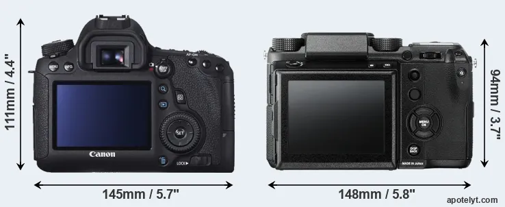 La Canon EOS 6D e la Fujifilm GFX 50S sono due fotocamere digitali rivelate al pubblico rispettivamente a settembre 2012 e settembre 2016. Il 6D è una fotocamera DSLR, mentre GFX 50S è una fotocamera mirrorless con obiettivo intercambiabile.Le fotocamere sono dotati di un sensore full frame (6D) e un sensore di medio formato (GFX 50S). La Canon ha una risoluzione di 20,0 megapixel, mentre la Fujifilm fornisce 51,1 MP.