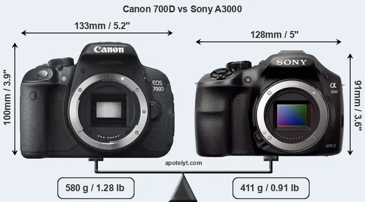 La Canon EOS 700D e la Sony Alpha A3000 sono due fotocamere digitali rivelate al pubblico rispettivamente a marzo 2013 e agosto 2013. Il 700D è una fotocamera DSLR, mentre A3000 è una fotocamera mirrorless con obiettivo intercambiabile.Entrambe le fotocamere sono dotati di un sensore APS-C. La Canon ha una risoluzione di 17,9 megapixel, mentre la Sony fornisce 19,8 MP.