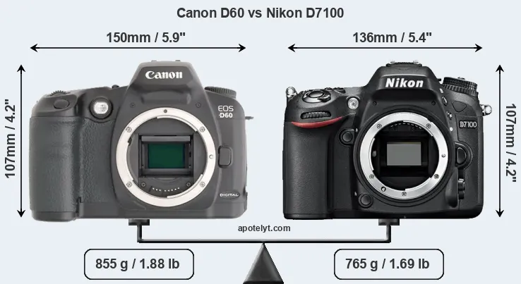 La Canon EOS-D60 e la Nikon D7100 sono due fotocamere digitali rivelate al pubblico rispettivamente a febbraio 2002 e febbraio 2013. Entrambe sono fotocamere DSLR (Digital Single Lens Reflex) che sono dotati di un sensore APS-C. La Canon ha una risoluzione di 6,3 megapixel, mentre la Nikon fornisce 24,0 MP.