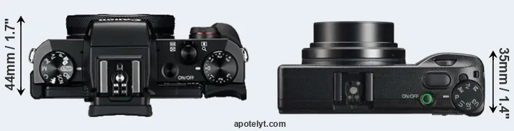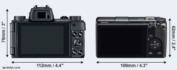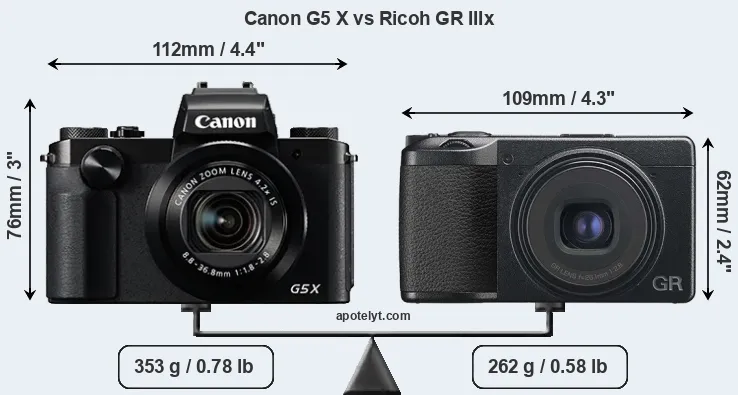 La dimensione fisica e il peso della Canon G5 X e Ricoh GR IIIx sono illustrate nel grafico sottostante. Le due fotocamere vengono visualizzate in base alle loro dimensioni relative. Tutte le dimensioni sono arrotondate al millimetro più vicino.