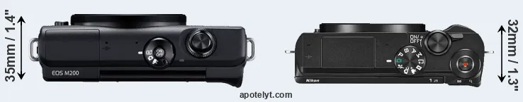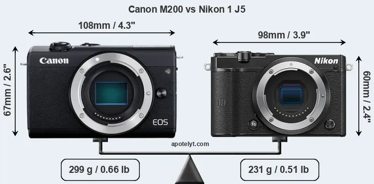 La Canon EOS M200 e la Nikon 1 J5 sono due fotocamere digitali rivelate al pubblico rispettivamente a settembre 2019 e aprile 2015. Entrambe sono fotocamera mirrorless con obiettivo intercambiabile, che sono dotati di un sensore APS-C (M200) e un sensore da 1 pollice (J5). La Canon ha una risoluzione di 24,0 megapixel, mentre la Nikon fornisce 20,7 MP.