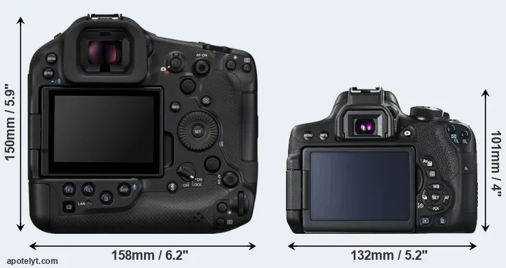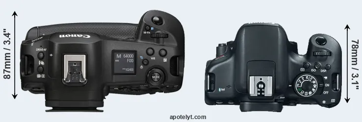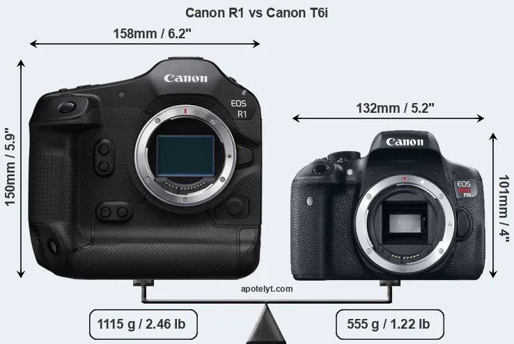La dimensione fisica e il peso della Canon R1 e Canon T6i sono illustrate nel grafico sottostante. Le due fotocamere vengono visualizzate in base alle loro dimensioni relative. Tutte le dimensioni sono arrotondate al millimetro più vicino.