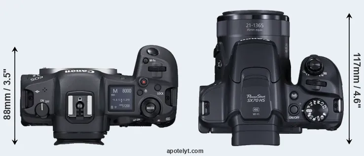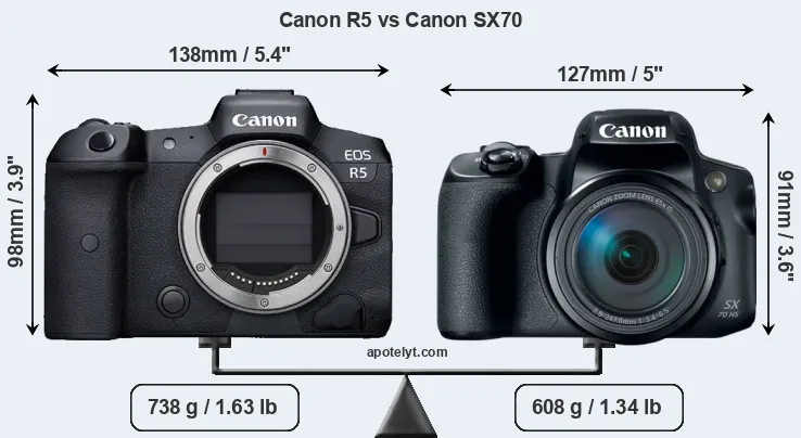 La Canon EOS R5 e la Canon PowerShot SX70 HS sono due fotocamere digitali rivelate al pubblico rispettivamente a luglio 2020 e settembre 2018. Il R5 è una fotocamera mirrorless con obiettivo intercambiabile, mentre SX70 è una fotocamera compatta con obiettivo integrato. Le fotocamere sono dotati di un sensore full frame (R5) e un sensore da 1/2,3 pollice (SX70). La R5 ha una risoluzione di 44,8 megapixel, mentre la SX70 fornisce 20,2 MP.