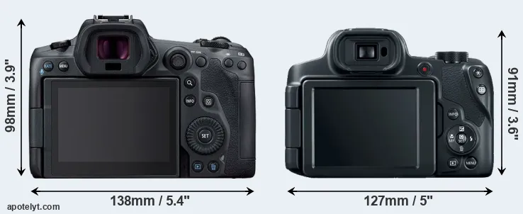 La dimensione fisica e il peso della Canon R5 e Canon SX70 sono illustrate nel grafico sottostante. Le due fotocamere vengono visualizzate in base alle loro dimensioni relative. Tutte le dimensioni sono arrotondate al millimetro più vicino.