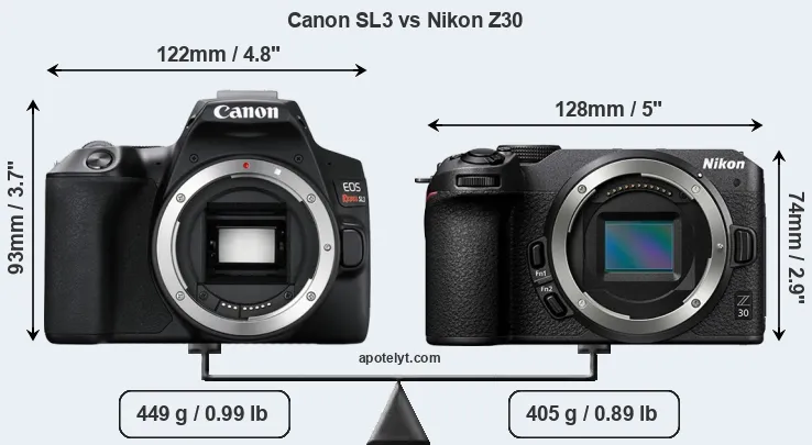 La Canon EOS Rebel SL3 e la Nikon Z30 sono due fotocamere digitali rivelate al pubblico rispettivamente a aprile 2019 e giugno 2022. Il SL3 è una fotocamera DSLR, mentre Z30 è una fotocamera mirrorless con obiettivo intercambiabile.Entrambe le fotocamere sono dotati di un sensore APS-C. La Canon ha una risoluzione di 24,0 megapixel, mentre la Nikon fornisce 20,7 MP.